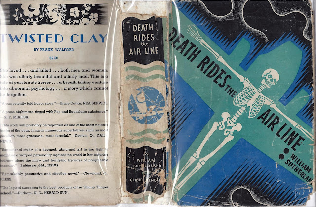 | a very fragile copy of the Death Rides the Air Line dust jacket (Claude Kendall) note the advertisement for the controversial Twisted Clay on the back panel |